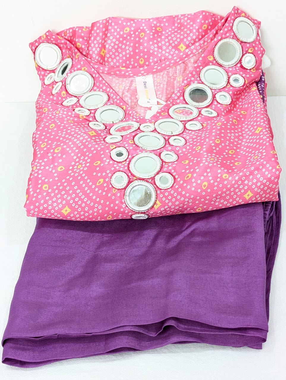 This kaftan has beautiful mirrorwork on neckline. On sides beautiful pom-pom lace is attached to make it more attractive.This is in double shade concept.This kaftan is pairs with loose style plazo. Inner will also come with this kaftan.